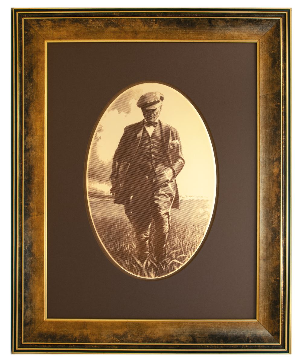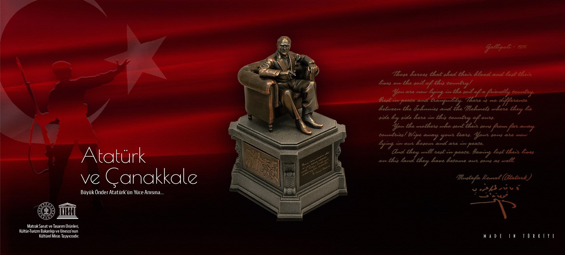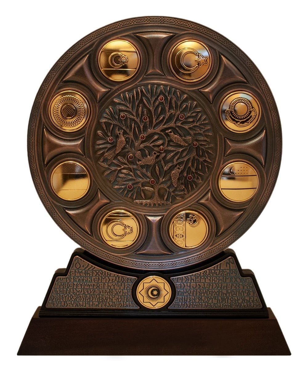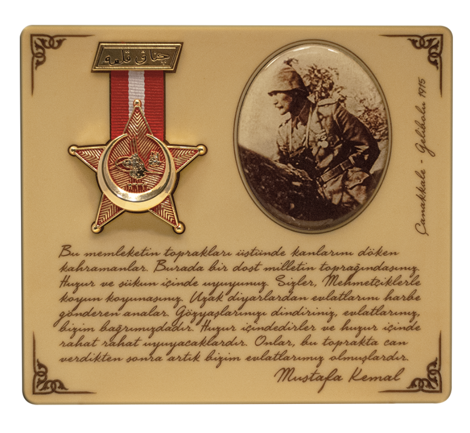 Ata'mızın rozet rölyefi, bronz meşe yapraklarıyla bezelidir.